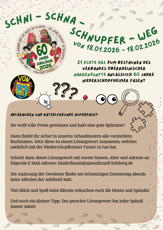Der Jubiläumssonntag, 01.02.2026, beginnt um 10:45 Uhr mit einer Narrenmesse in der St. Brigitta-Kirche in Niederschopfheim. Im Anschluss ist das Narrendorf eröffnet. Das Highlight ist unser Jubiläumsumzug, welcher um 13:33 Uhr startet. Hier feiern wir nicht nur unser Jubiläum, sondern auch das 24. Vogteitreffen der Vogtei Ortenau des Verbandes Oberrheinischer Narrenzünfte. Für den Jubiläumsumzug wird ein Eintrittsgeld in Höhe von 5 € pro Person (unter 16 Jahren freier Eintritt zum Umzug) erhoben.